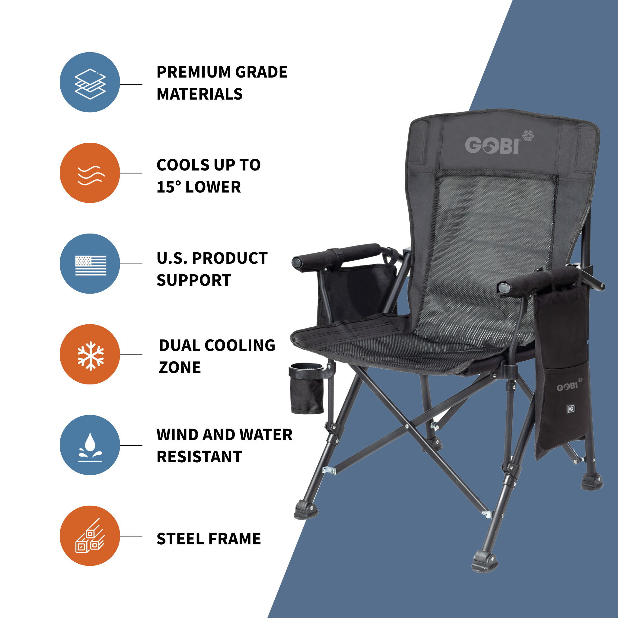 The Zephyr Cooling Chair was developed and designed by Gobi Heat®, a leader in premium outdoor temperature-controlled gear, ensuring quality and innovation.