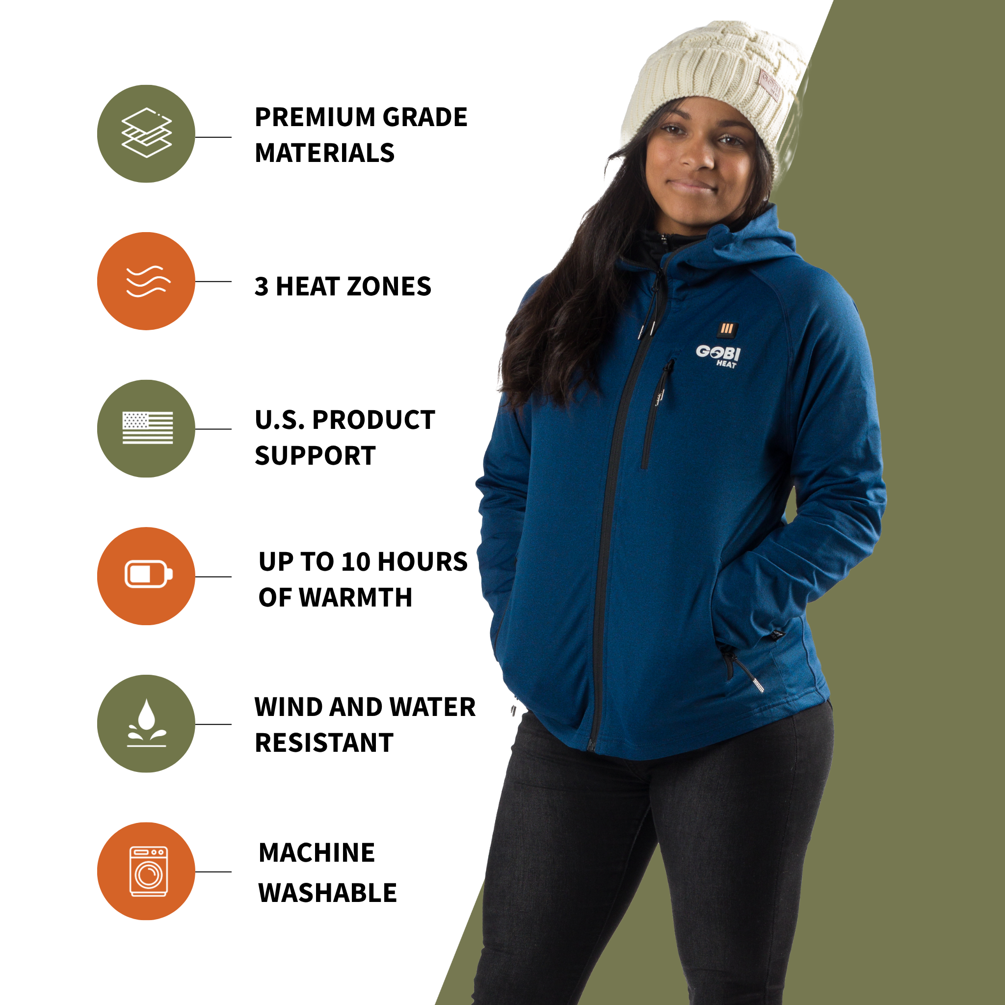 The Apex Heated Tech Hoodie is Gobi Heat’s trendiest heated jacket yet. Featuring a full-zip design and a flexible, lightweight fabric, the Apex tech hoodie brings you warmth wherever your day takes you. This heated lightweight hoodie is battery powered and contains our premium and efficient conductive thread heat system. Featuring three customizable levels of heat, you take control of your comfort and set the jacket to the heat setting you desire. We are excited to offer our premium heated jacket in two colors, Coal Black and Ocean Blue. Stay dry, warm and comfortable without the restraints of a stiffer fitting jacket. New Quick-Charge Multi-Voltage Battery!