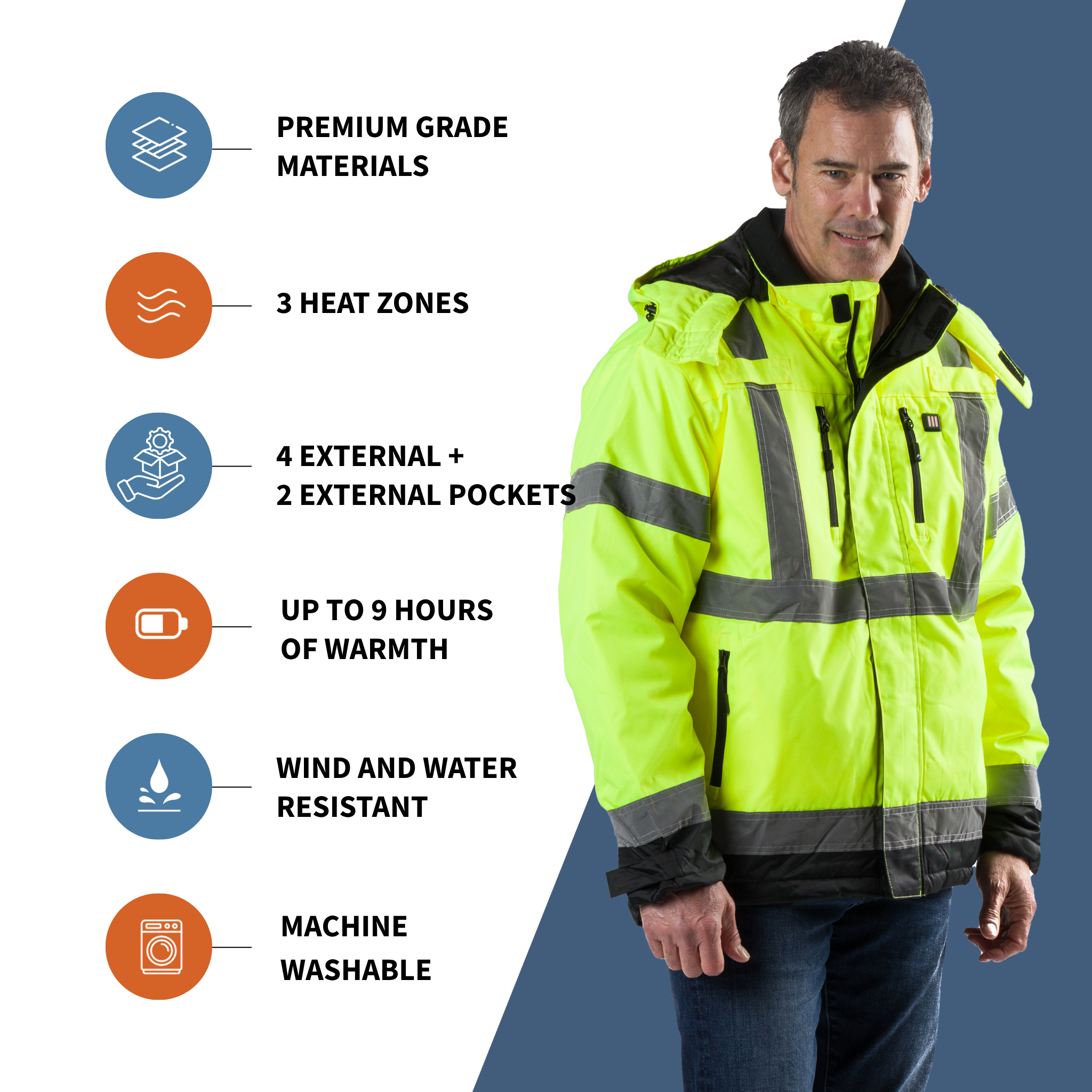 Flash Heated High-Vis Jacket — 3 Bar Button Low/Med/High