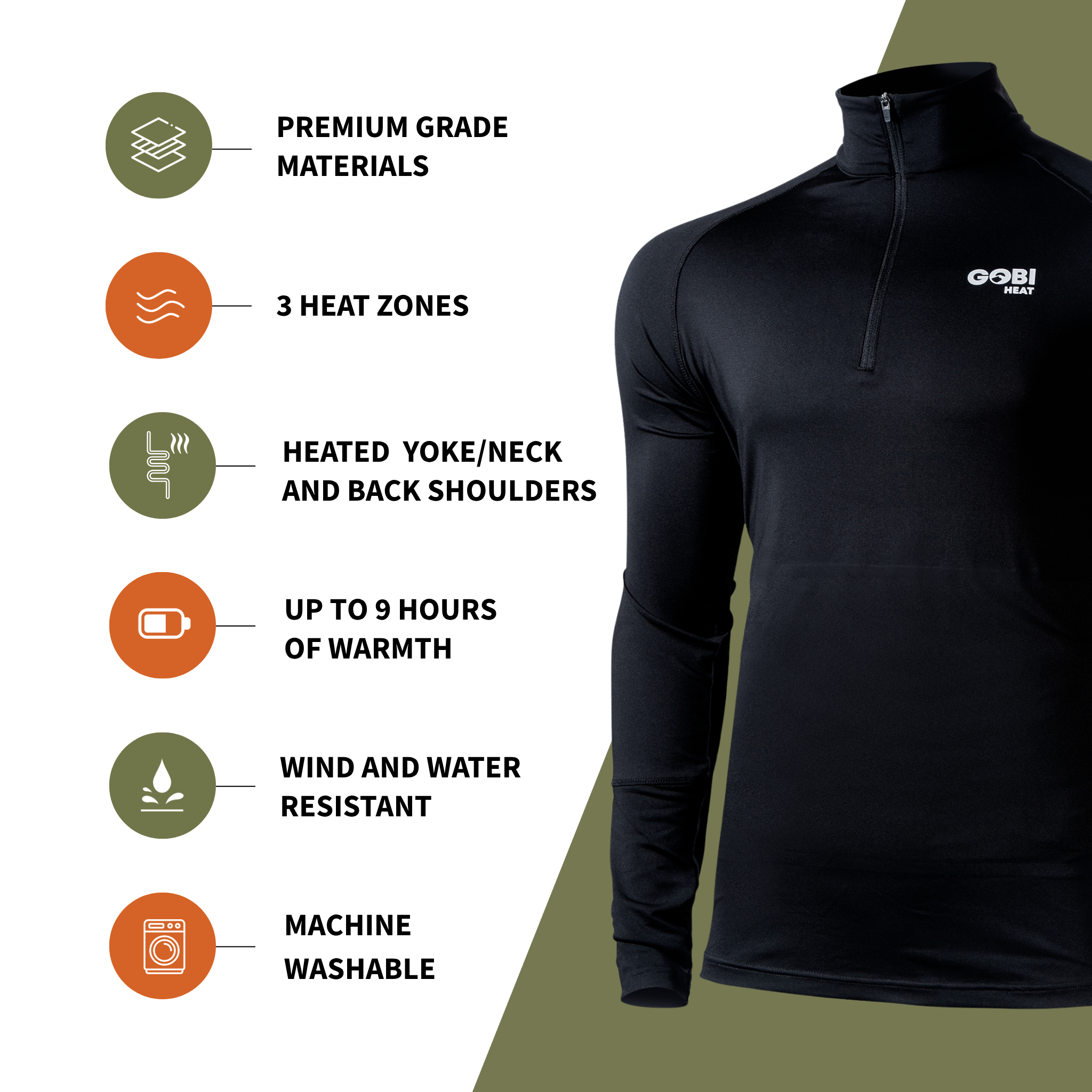 Conquer the cold with confidence. The Gobi Heat® FlexCore Men’s Heated Base Layer Shirt features dual control technology, giving you the power to heat the front, back, or both zones independently. With three targeted heat zones across the neck, chest and back and three heat settings, you’ll enjoy warmth your way—whether you’re working outdoors, hitting the slopes, or braving a freezing commute.