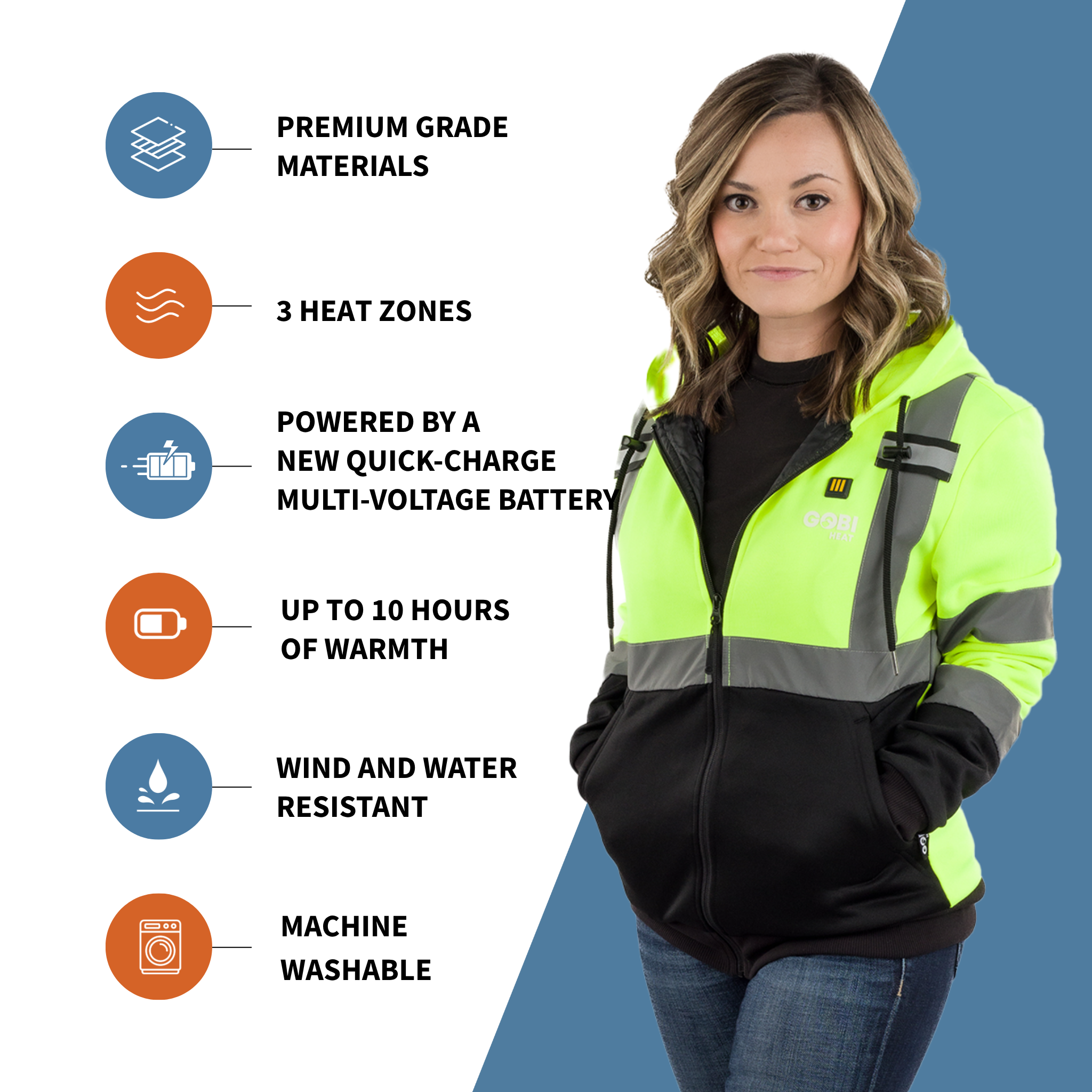 Beam Women's Workwear Heated High-Vis Hoodie — 3 Bar Button Low/Med/High