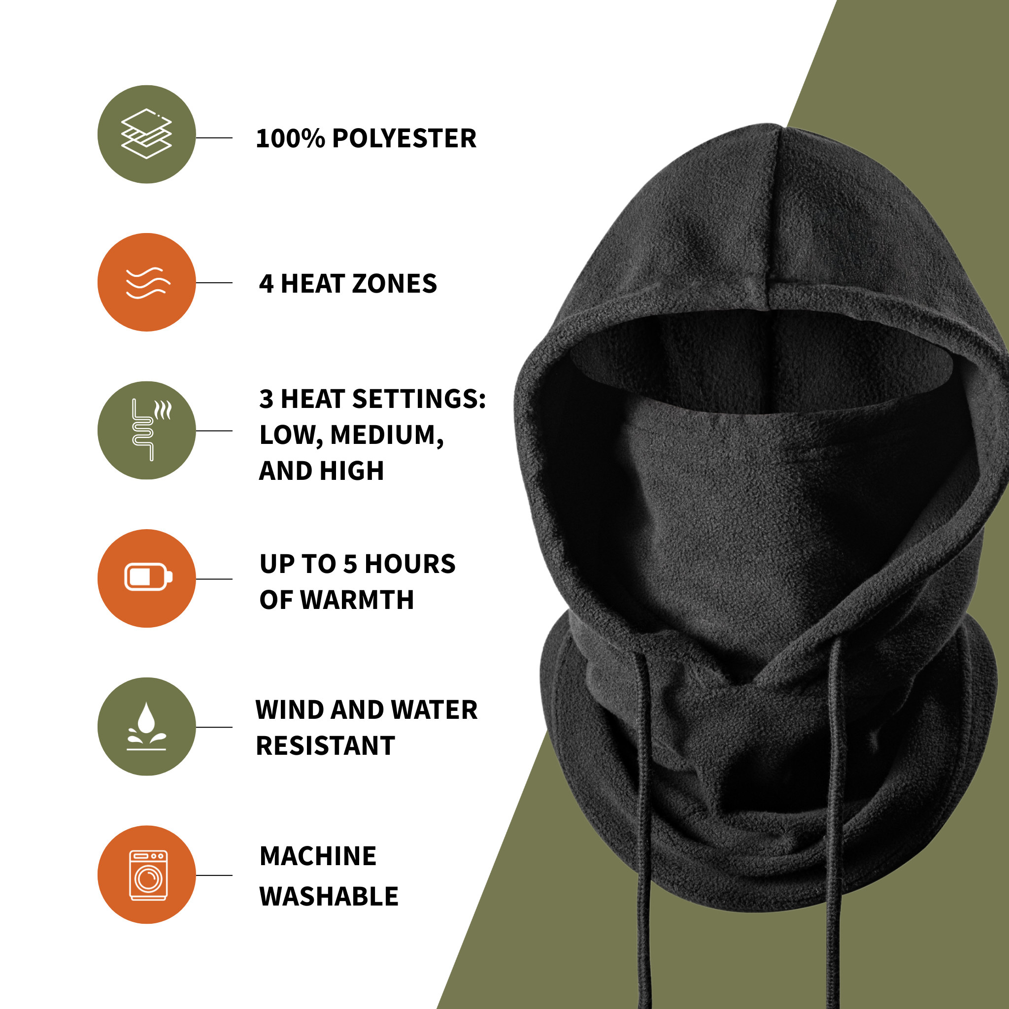 • Ultra-soft polar fleece keeps you warm and comfortable without added bulk. • Four targeted heat zones: ears, mouth, and back of the neck • Three heat levels — low, medium, or high • Up to 5 hours of warmth on a single charge • Machine washable once the battery is removed • Sleek black design for versatile layering • One size fits all